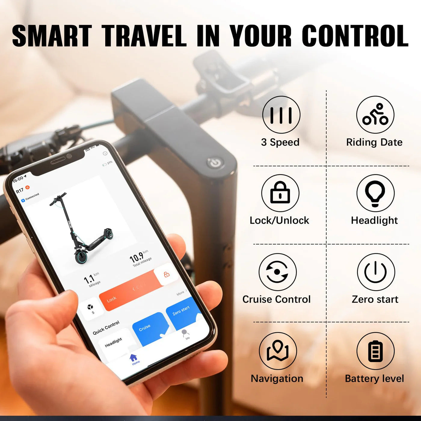 【APP control】: R17 is an App-enabled electric scooter that works with Android /iOS devices. The APP Support Scooter Open/Lock,Headlight, Navigation, Set personal information, View riding data,Cruise Control,Battery Usage and Faulty indication.